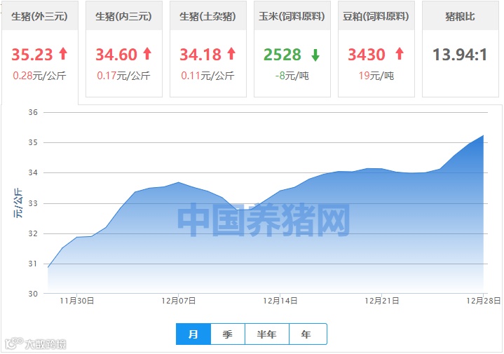| 地区名称 | 外三元(元/公斤) | 内三元(元/公斤) | 土杂猪(元/公斤) | 玉米(元/吨) | 豆粕(元/吨) |