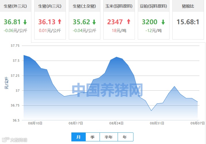 | 地区名称 | 外三元(元/公斤) | 内三元(元/公斤) | 土杂猪(元/公斤) | 玉米(元/吨) | 豆粕(元/吨) |