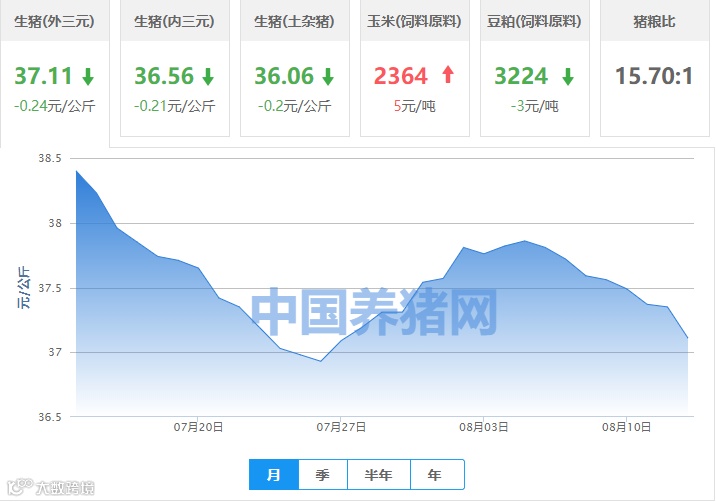 | 地区名称 | 外三元(元/公斤) | 内三元(元/公斤) | 土杂猪(元/公斤) | 玉米(元/吨) | 豆粕(元/吨) |