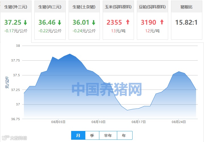 | 地区名称 | 外三元(元/公斤) | 内三元(元/公斤) | 土杂猪(元/公斤) | 玉米(元/吨) | 豆粕(元/吨) |