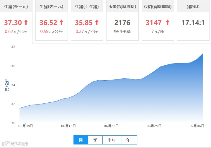 | 地区名称 | 外三元(元/公斤) | 内三元(元/公斤) | 土杂猪(元/公斤) | 玉米(元/吨) | 豆粕(元/吨) |