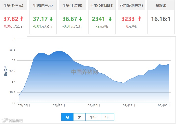 | 地区名称 | 外三元(元/公斤) | 内三元(元/公斤) | 土杂猪(元/公斤) | 玉米(元/吨) | 豆粕(元/吨) |