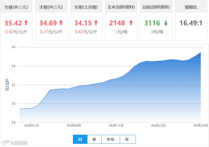 | 地区名称 | 外三元(元/公斤) | 内三元(元/公斤) | 土杂猪(元/公斤) | 玉米(元/吨) | 豆粕(元/吨) |