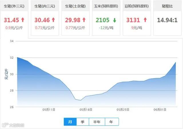 6月4日外三元生猪价格排行榜(元/公斤):11省区猪价在30元/公斤以下,今日猪价高低价差5.5元/公斤。
