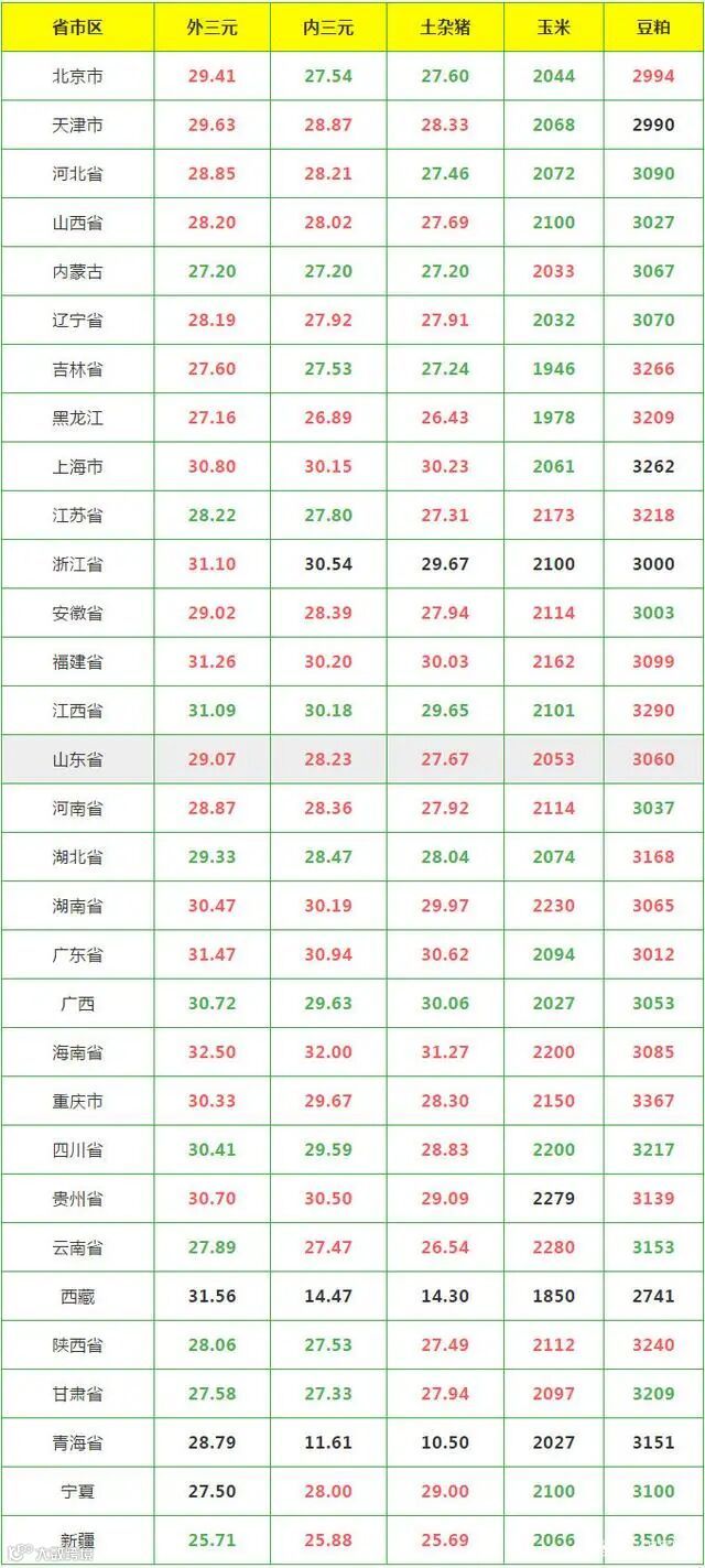 5月29日外三元猪价涨跌表(元/公斤):18涨,10跌。