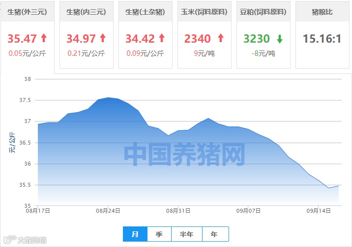 | 地区名称 | 外三元(元/公斤) | 内三元(元/公斤) | 土杂猪(元/公斤) | 玉米(元/吨) | 豆粕(元/吨) |