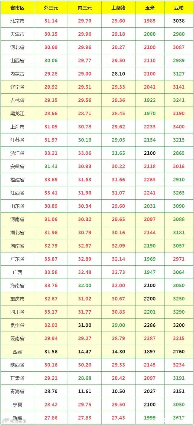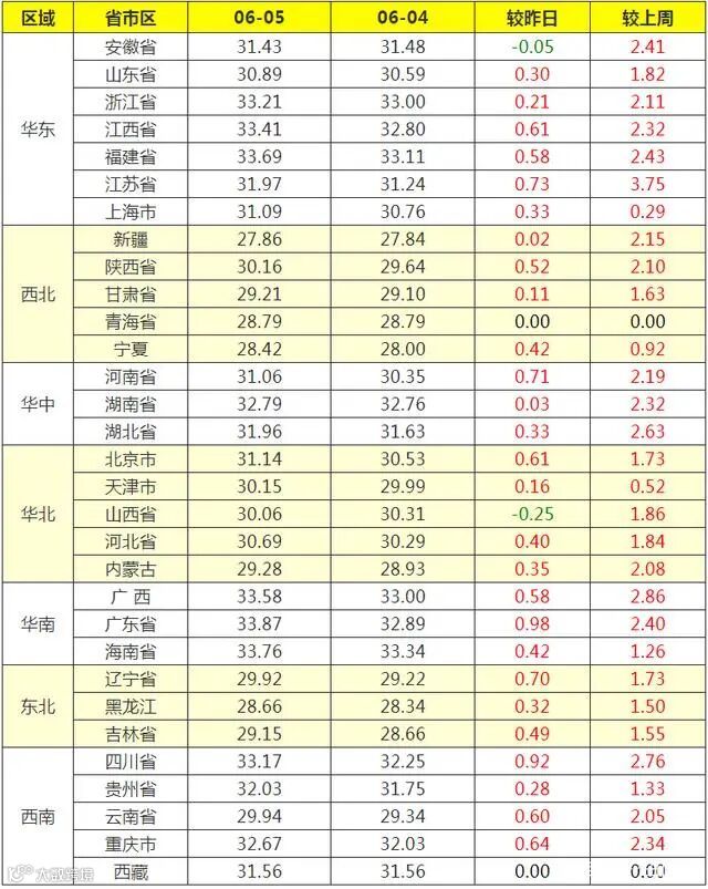 6月5日外三元猪价涨跌表(元/公斤):27涨,2跌,2稳。