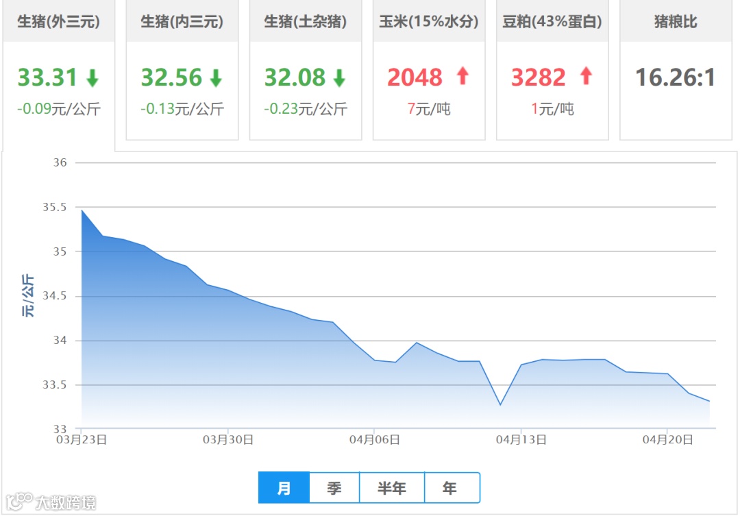 | 地区名称 | 外三元(元/公斤) | 内三元(元/公斤) | 土杂猪(元/公斤) | 玉米(元/吨) | 豆粕(元/吨) |