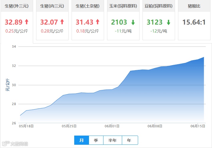 | 地区名称 | 外三元(元/公斤) | 内三元(元/公斤) | 土杂猪(元/公斤) | 玉米(元/吨) | 豆粕(元/吨) |