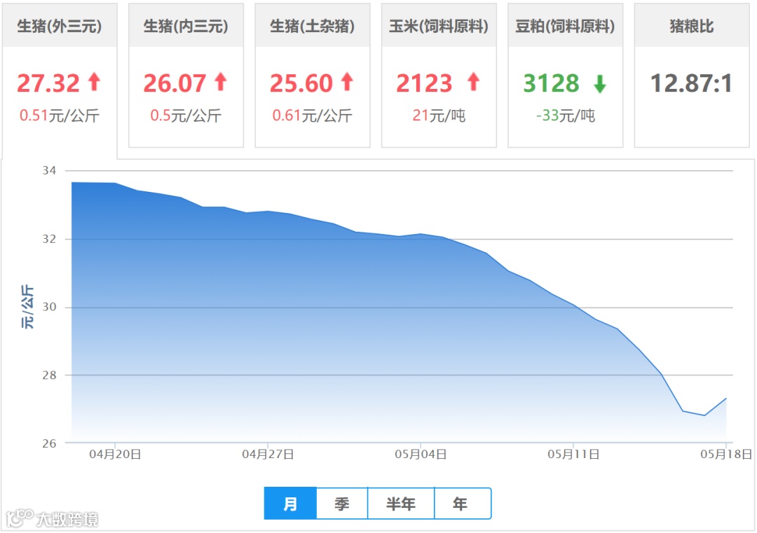 | 地区名称 | 外三元(元/公斤) | 内三元(元/公斤) | 土杂猪(元/公斤) | 玉米(元/吨) | 豆粕(元/吨) |