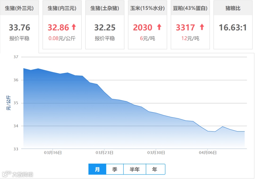 | 地区名称 | 外三元(元/公斤) | 内三元(元/公斤) | 土杂猪(元/公斤) | 玉米(元/吨) | 豆粕(元/吨) |