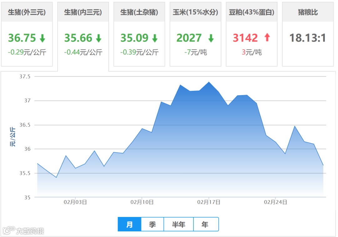 | 地区名称 | 外三元(元/公斤) | 内三元(元/公斤) | 土杂猪(元/公斤) | 玉米(元/吨) | 豆粕(元/吨) |