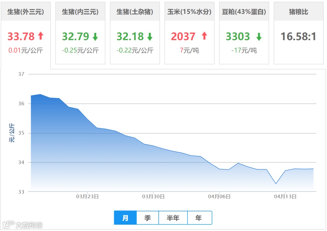 | 地区名称 | 外三元(元/公斤) | 内三元(元/公斤) | 土杂猪(元/公斤) | 玉米(元/吨) | 豆粕(元/吨) |