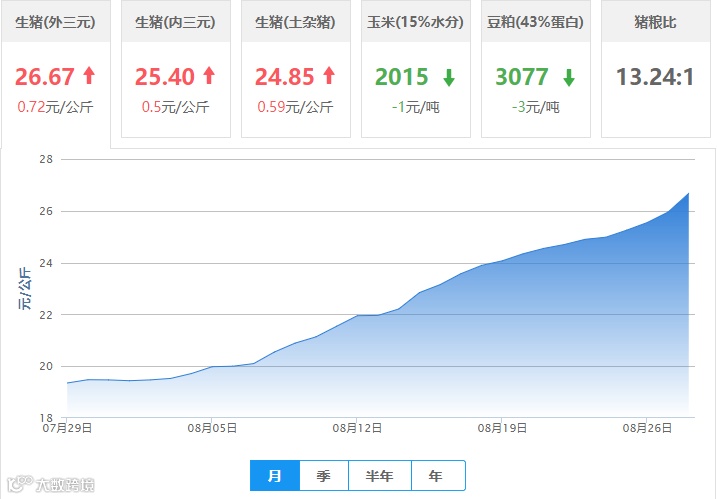 | 地区名称 | 外三元(元/公斤) | 内三元(元/公斤) | 土杂猪(元/公斤) | 玉米(元/吨) | 豆粕(元/吨) |