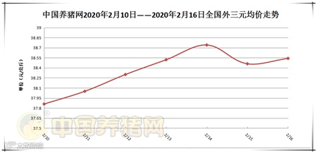 2020年2月16日,据中国养猪网猪价系统监测全国外三元均价为38.54元/公斤,价格较昨日上涨了0.08元/公斤。上周全国外三元均价为37.78元/公斤,今日较上周上涨了0.76元/公斤。内三元均价为37.20元/公斤,较昨日上涨了0.01元/公斤。土杂猪均价为36.73元/公斤,较昨天上涨了0.17元/公斤。