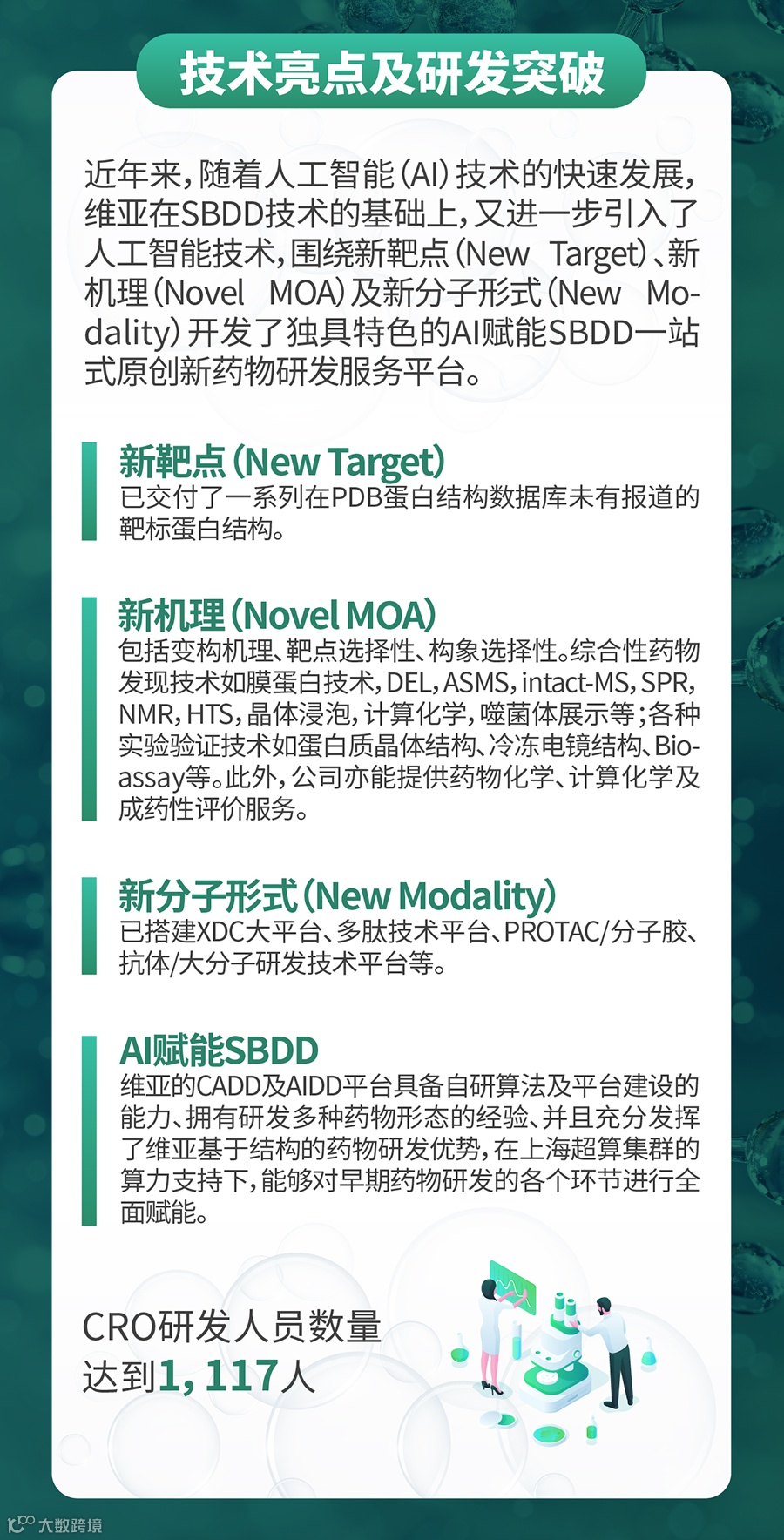 维亚生物(01873. HK)成立于 2008 年,向全球创新药研发企业提供从早期基于结构的药物研发到商业化药物生产的一站式综合服务。凭借在基于结构的药物研发(SBDD)技术领域的领先优势,我们向全球合作伙伴提供新药研究阶段的CRO服务,搭建了X射线蛋白晶体技术、冷冻电镜技术(Cryo-EM)、DNA编码化合物库技术(DEL)、亲和力质谱筛选技术(ASMS)、表面等离子共振技术(SPR)、氢氘交换质谱技术(HDX-MS)、AIDD/CADD等多个先进技术平台,并有资深药物化学家与药物发现生物专家领军的团队提供药物设计、药物化学(H2L,LO)、化合物合成、化学分析及纯化、公斤级放大及多肽合成及相应的生物活性测试服务。通过子公司朗华制药,我们提供从临床前开发到商业化生产的一站式CMC/CDMO解决方案。同时,我们专注于发现、投资高潜力生物医药初创公司,以独创的技术服务换取股权(EFS)的商业模式,解决未满足的临床需求。