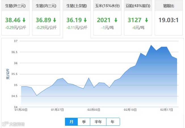 | 地区名称 | 外三元(元/公斤) | 内三元(元/公斤) | 土杂猪(元/公斤) | 玉米(元/吨) | 豆粕(元/吨) |