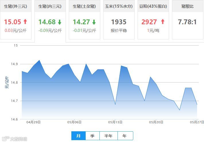 | 地区名称 | 外三元(元/公斤) | 内三元(元/公斤) | 土杂猪(元/公斤) | 玉米(元/吨) | 豆粕(元/吨) |