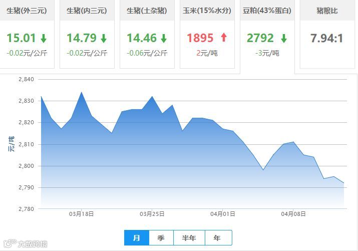 | 地区名称 | 外三元(元/公斤) | 内三元(元/公斤) | 土杂猪(元/公斤) | 玉米(元/吨) | 豆粕(元/吨) |