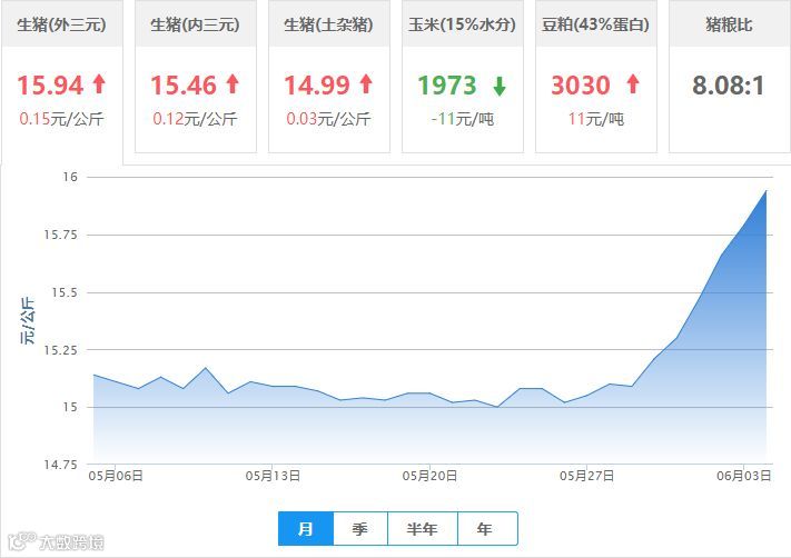 | 地区名称 | 外三元(元/公斤) | 内三元(元/公斤) | 土杂猪(元/公斤) | 玉米(元/吨) | 豆粕(元/吨) |