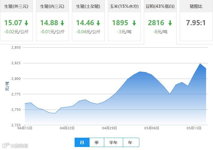 | 地区名称 | 外三元(元/公斤) | 内三元(元/公斤) | 土杂猪(元/公斤) | 玉米(元/吨) | 豆粕(元/吨) |