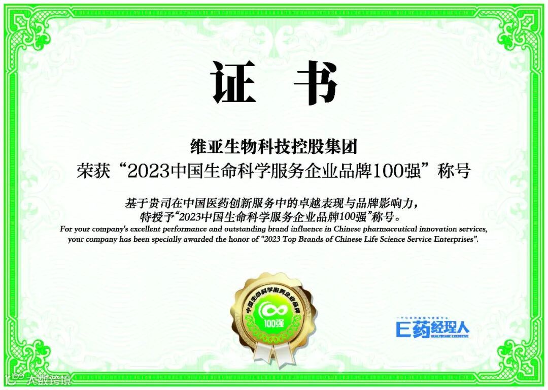 2023年11月1日-3日,中国医药企业管理协会、中国医药生物技术协会、杭州市投资促进局以及杭州市临平区商务局在杭州联合举办了“2023第十五届中国医药企业家科学家投资家大会”(以下简称“启思会”)。大会上,E药经理人隆重发布“中国生命科学服务企业品牌100强”榜单。维亚生物凭借着在中国医药创新服务中的卓越表现及品牌影响力,荣获“2023中国生命科学服务企业品牌100强”称号。