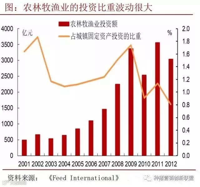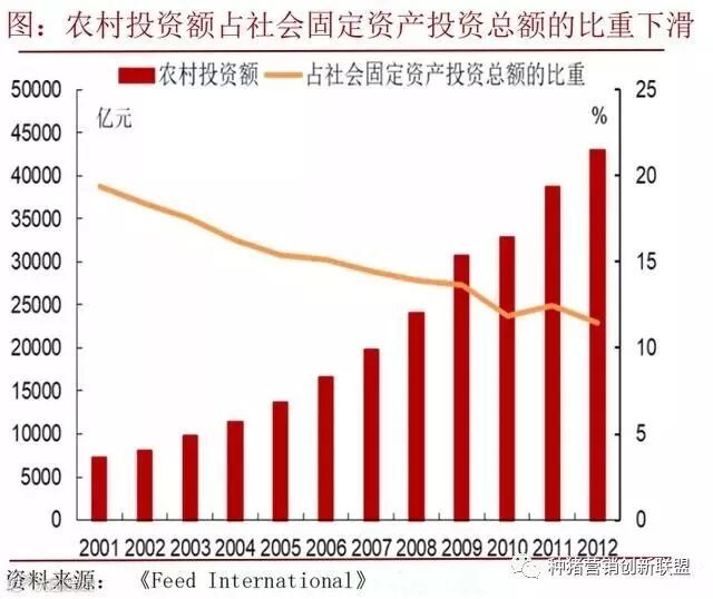 2001-2012 年,中国社会固定资产投资中,尽管农村投资额由 7212.3 亿元上升到43012.3 亿元,但占社会固定资产投资总额的比重却从19.38% 一路下滑到 11.48%;城镇固定资产投资中,农林牧渔业的投资比重从1.64%下降到0.81%,波动极大。