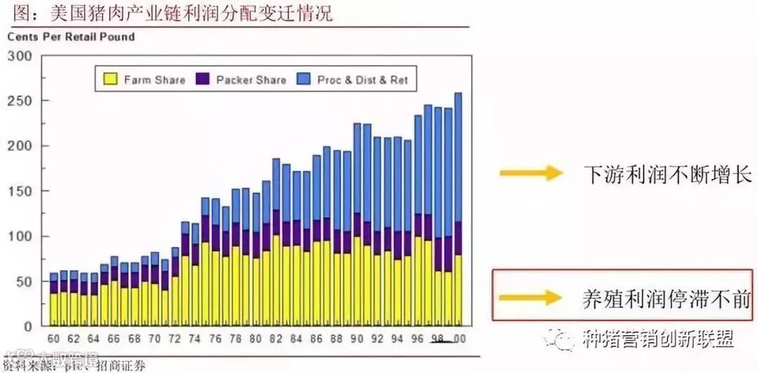 美国的猪肉产业链实际上很健康,总利润不断增长,只是利润分配方面,养殖业处于弱势地位,下游处于强势地位。