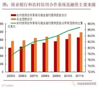 商业银行和农村信用合作系统是农业融资的主要来源。商业银行和农村信用合作系统提供的资金占 80%左右。