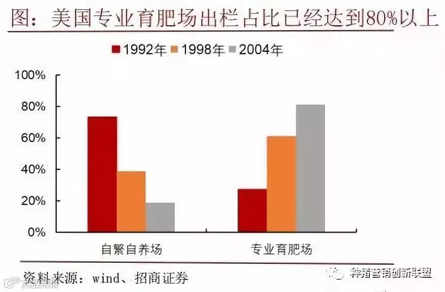 生猪养殖规模化的不断推进带来了养殖场的专业化发展,保育场只负责保育,育肥场只进行育肥。1992年育繁一体化的猪场出栏占比在60%以上。 随着规模化程度的提高,专业化的养殖方式不断推广,到2004年,专门的育肥场数量占比已经达到80%左右,而传统的一体化猪场占比不足20%。