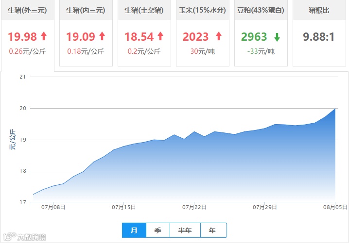 | 地区名称 | 外三元(元/公斤) | 内三元(元/公斤) | 土杂猪(元/公斤) | 玉米(元/吨) | 豆粕(元/吨) |