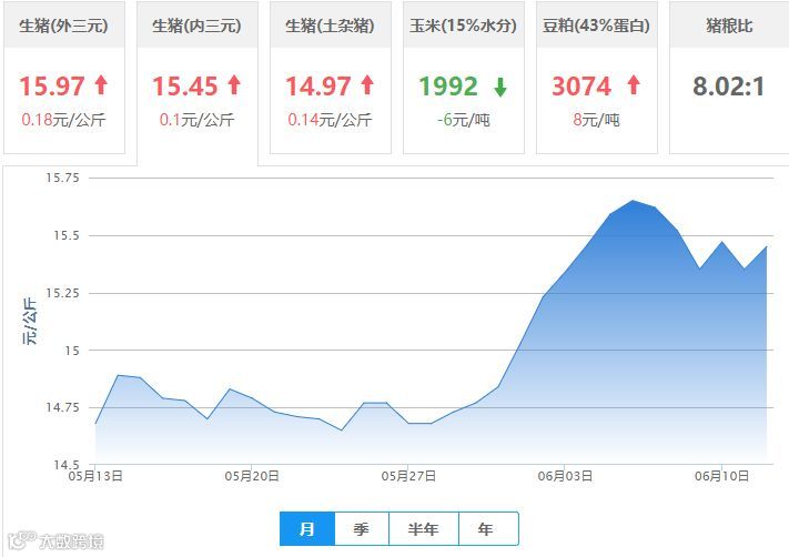 | 地区名称 | 外三元(元/公斤) | 内三元(元/公斤) | 土杂猪(元/公斤) | 玉米(元/吨) | 豆粕(元/吨) |