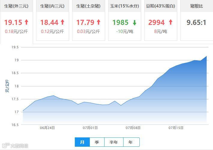 | 地区名称 | 外三元(元/公斤) | 内三元(元/公斤) | 土杂猪(元/公斤) | 玉米(元/吨) | 豆粕(元/吨) |