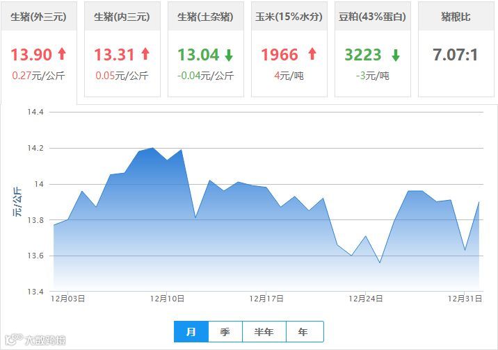 | 地区名称 | 外三元(元/公斤) | 内三元(元/公斤) | 土杂猪(元/公斤) | 玉米(元/吨) | 豆粕(元/吨) |