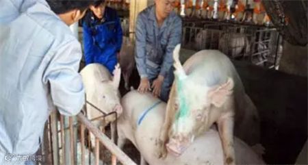 3、针对饲养在定位栏的断奶母猪,每天至少两次使用公猪进行发情诱导,注意每次诱情尽量使用不同的公猪,持续 5~10 分钟,另外使用多头公猪对定位栏的断奶母猪进行诱情时,尽量用简易门板或栅栏将公猪隔开,门板间以 4~5 头母猪为宜,即一头公猪每次刺激 4~5 头母猪为宜。