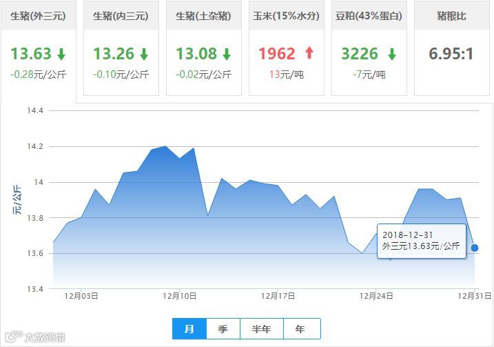 | 地区名称 | 外三元(元/公斤) | 内三元(元/公斤) | 土杂猪(元/公斤) | 玉米(元/吨) | 豆粕(元/吨) |