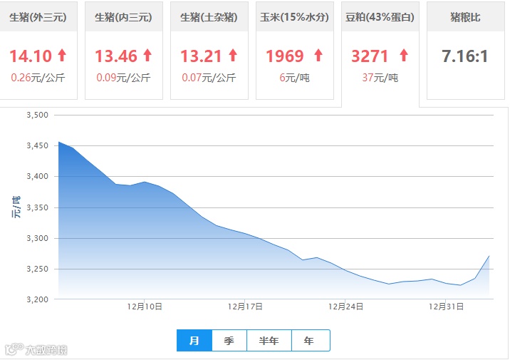 | 地区名称 | 外三元(元/公斤) | 内三元(元/公斤) | 土杂猪(元/公斤) | 玉米(元/吨) | 豆粕(元/吨) |