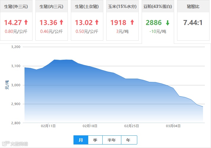 | 地区名称 | 外三元(元/公斤) | 内三元(元/公斤) | 土杂猪(元/公斤) | 玉米(元/吨) | 豆粕(元/吨) |