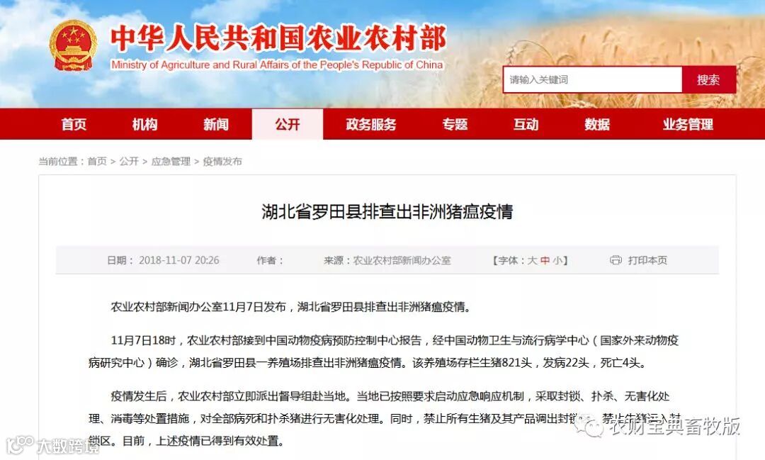 农业农村部新闻办公室11月7日发布,湖北省黄冈市罗田县排查出非洲猪瘟疫情。