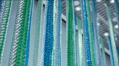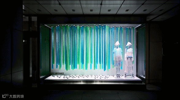 三宅一生春夏系列的灵感来源于冰岛丰富的自然风光。颜色是从一系列的风景中挑选出来的。在橱窗内悬挂70条织物,并通过马达控制它们,使它们垂直伸缩,有时是一致的,有时是随机的,一个像在森林中呼吸的生物空间被重新创造出来。