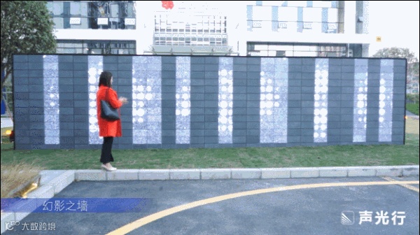 “幻影之墙”是由具有透光性的高科技艺术建筑材料“艺术水泥砖”搭建而成的新媒体艺术装置。水泥砖内安置有传感器,根据周围噪声分贝的不同,水泥砖上的图案效果会随之变幻,艺术感十足!