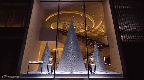 在面向银座大街的MIKIMOTO橱窗里,是三棵金字塔形状的树。位于中间的主树大约是6米高,位于两边的是两棵较小的树,大约2.5米高。