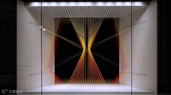 这个装置由12层垂直拉伸的线组成,这些线在电机的控制下有规律地、大胆地改变其形状。在大型展览中,剪影和云纹会随着观看角度的变化而动态变化。