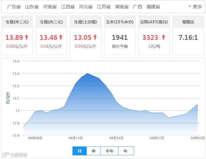 2018年09月03日全国外三元生猪价格行情涨跌表