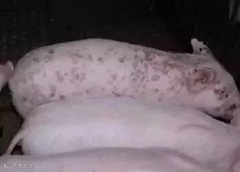 多群发而且点要小很多,吃喝影响不明显,主要在病猪耳部、背部、腹部、前肢、后腿、臀部等部位广泛性出现各种大小不一的红斑、斑点、丘疹,圆形或不规则的隆起,呈现红色或紫色,中央为黑色的病灶,持续时间长,指压不褪色,保育猪和生长猪多发,病猪可见腹股沟淋巴结明显肿大,抗生素治疗效果不佳;