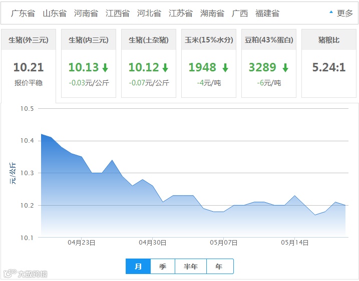 2018年05月19日全国外三元生猪价格行情涨跌表
