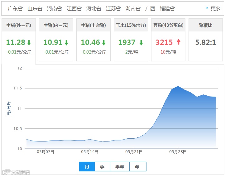 2018年06月03日全国外三元生猪价格行情涨跌表
