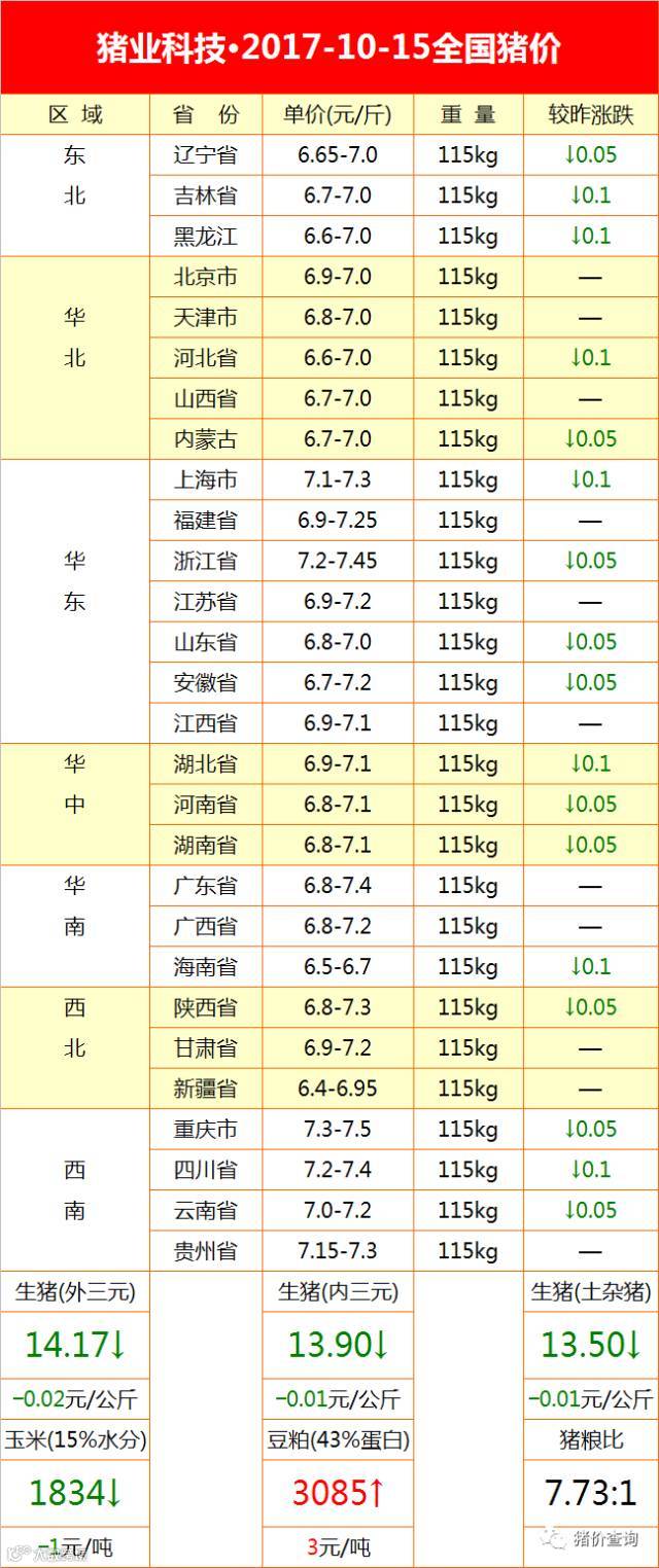 今日四川、陕西、广西等19个地区下跌0.05-0.2元/kg,其余9个地区保持稳定,当前生猪最高价是重庆14.7元/公斤,最低价是海南13.3元/公斤;地区最高价是西南地区,最低东北地区。