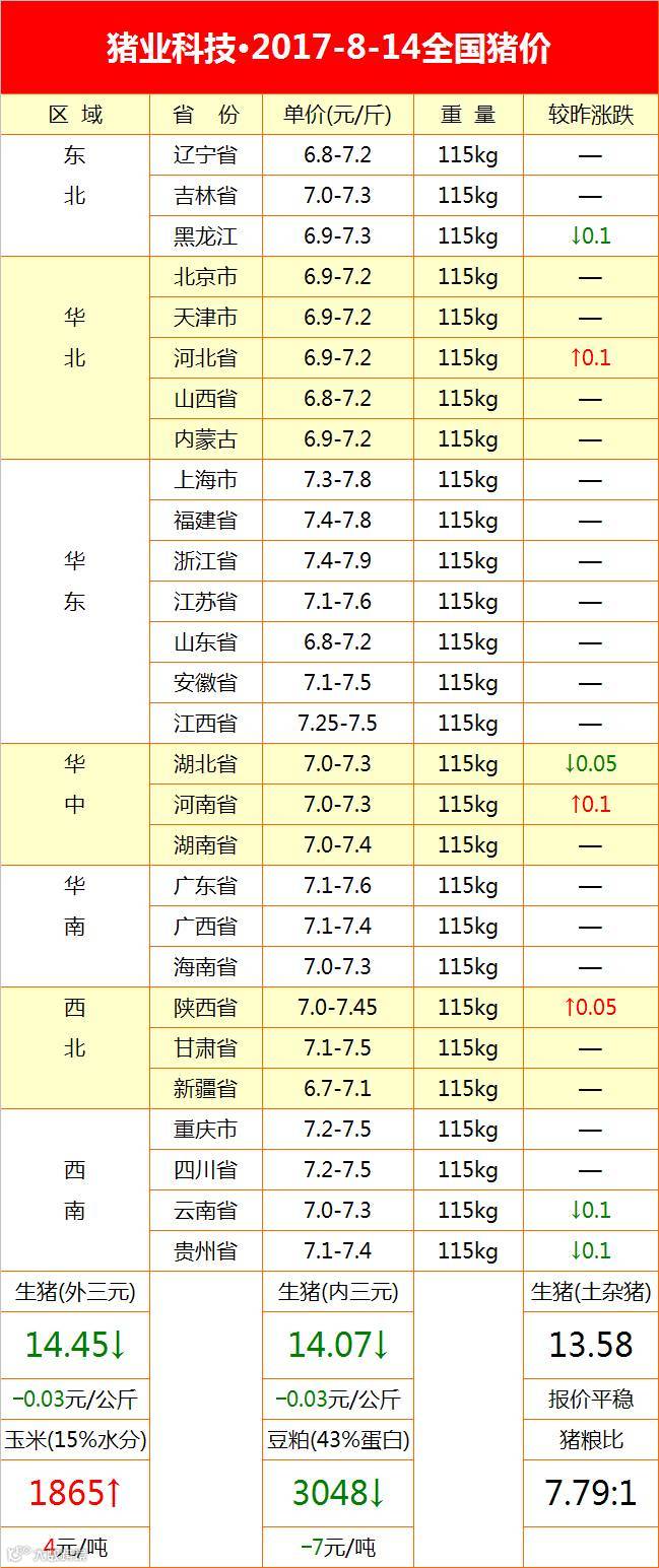 2017年8月14日据猪价格网统计全国生猪均价为14.48元/公斤,较昨日猪价下跌0.01元/公斤,较上周猪价下跌0.09元/公斤,涨幅维持在0.01-0.70元/公斤,跌幅维持在0.01-0.60元/公斤。全国下跌地区较多,上涨地区较少。浙江省、江西省、福建省、江苏省、甘肃省、宁夏、湖北省、天津市和内蒙古上涨,其余各省市均出现一定幅度的下跌或持平。