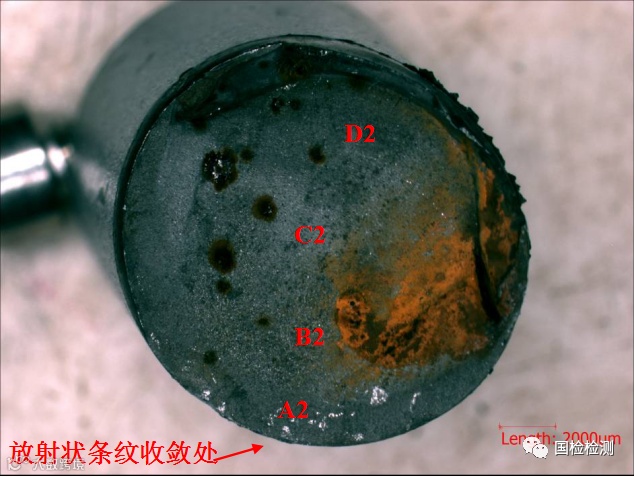 图12所示3#断口低倍形貌,断口平整,无明显塑性变形,并可见明显的锈蚀痕迹。断面隐约可见放射状条纹,条纹收敛于断口边缘(箭头所示)。将断口分为A2、B2、C2、D2四个区域进一步描述。